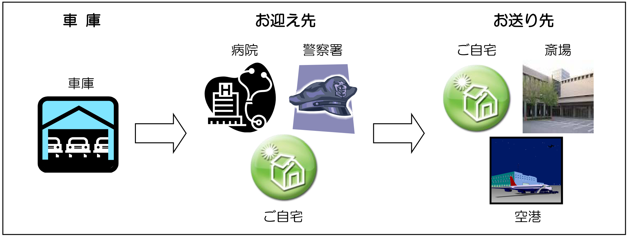 病院(老人ホーム、警察署など)のお迎えからご自宅や斎場などでのご安置まで、スタッフ2名体制で、ご遺族様のご要望にきめ細かにお応えいたします。ご指示いただければ、弊社スタッフだけでも迅速、丁寧な対応が可能です。